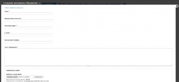 С ее помощью посетители сайта могут отправить свои отзывы и предложения для организации. Форма позволяет указать персональные данные, текст обращения, приложить файлы, - при этом вывода обращений на сайт не предусмотрено. Однако ответственные лица могут в полном объеме смотреть и сохранять все материалы обращений.