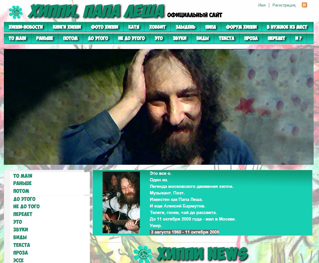 Главной задачей стало переформатирование сайта известного хиппи-музыканта Папы Леши в субкультурный портал. Предусмотрены пополнение хиппи-новостей, расширено меню, проведена демаркация разделов о самом музыканте и о субкультуре, расширен функционал.