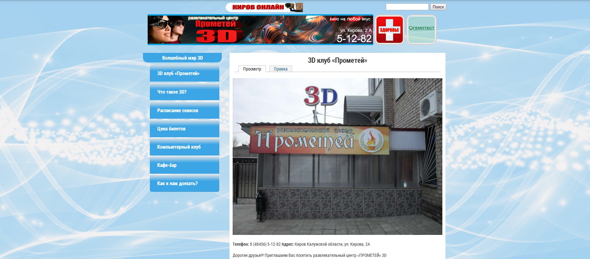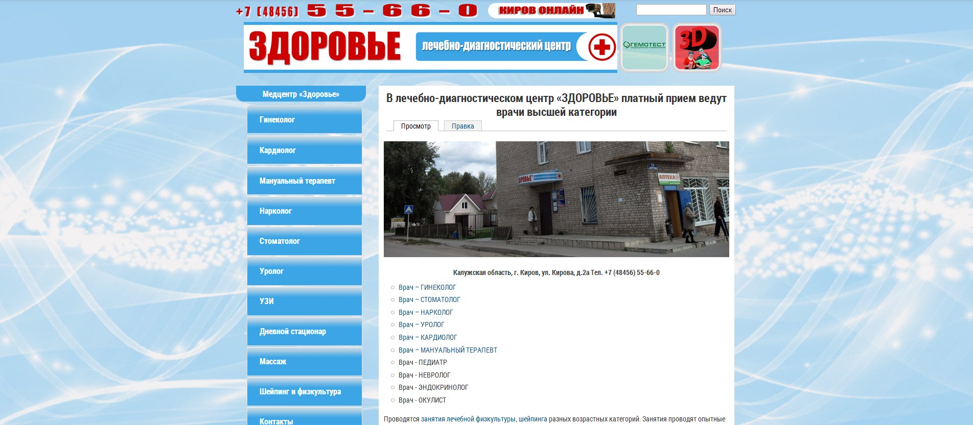 Сайт Лечебно-диагностического центра «Здоровье» (Киров Калужской области) решен как три раздела, составляющих единый сайт.