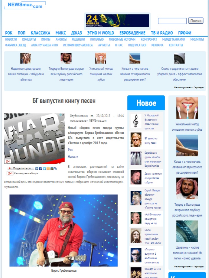 Ведущее российское СМИ по новостям музыки и шоу-бизнеса. Согласно желанию заказчика, весь контент четко поделен на музыкальные жанры. Встроен функционал комментирования, рейтингования, социальной сети. Удобная система тегирования, корректный подбор контекстных новостей, мощное кэширование. Создан как высоконагрузочная система, рассчитанная на высокую посещаемость. Многоступенчатая система защиты от взлома и спама.